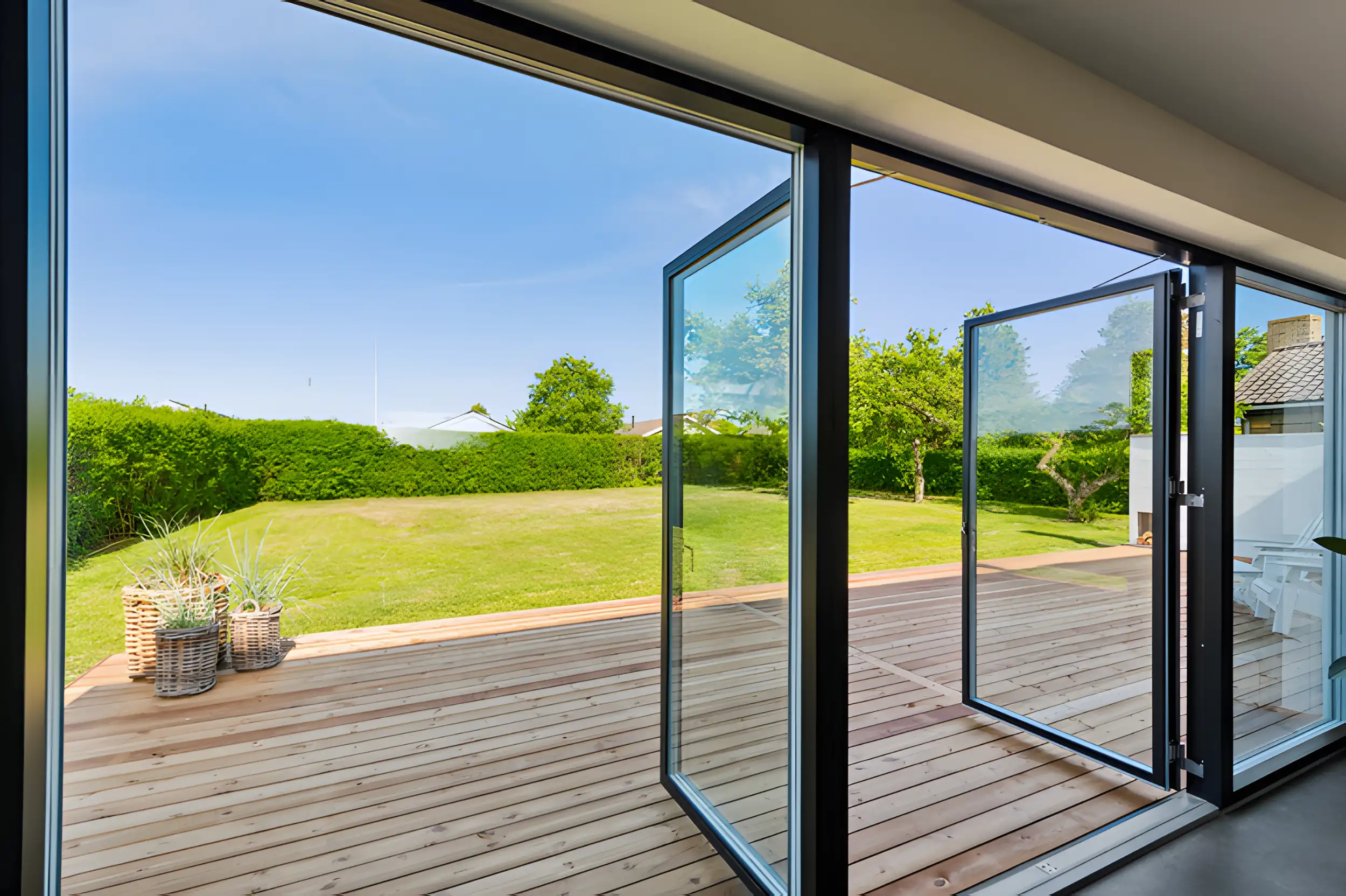 Lys stue med store vinduer, moderne møbler og grøn udsigt.